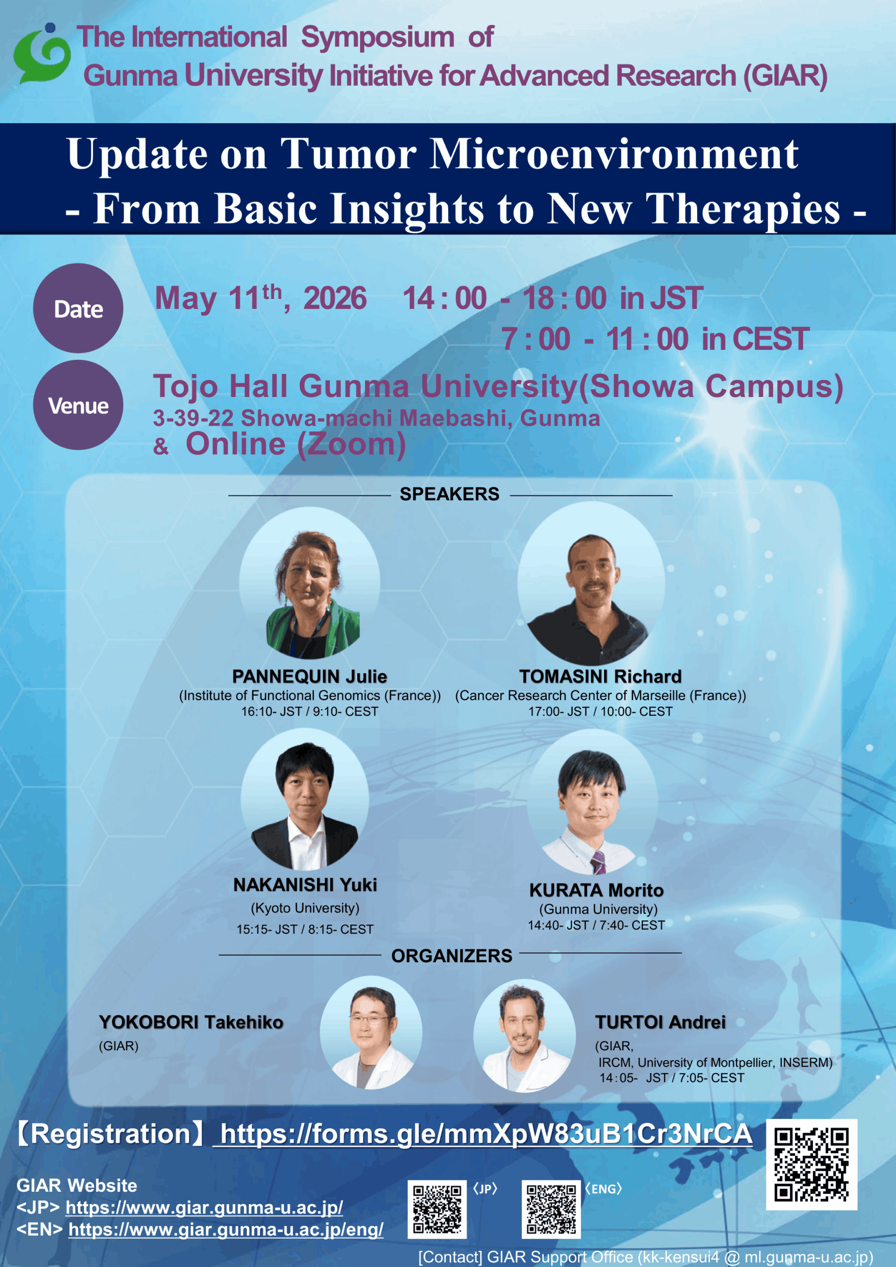 On May 11th 2026, GIAR will host the International Symposium of Gunma University Initiative for Advanced Research (GIAR) titled “Update on Tumor Microenvironment – From Basic Insights to New Therapies“. It will be held on-site and online. We look forward to your participation!