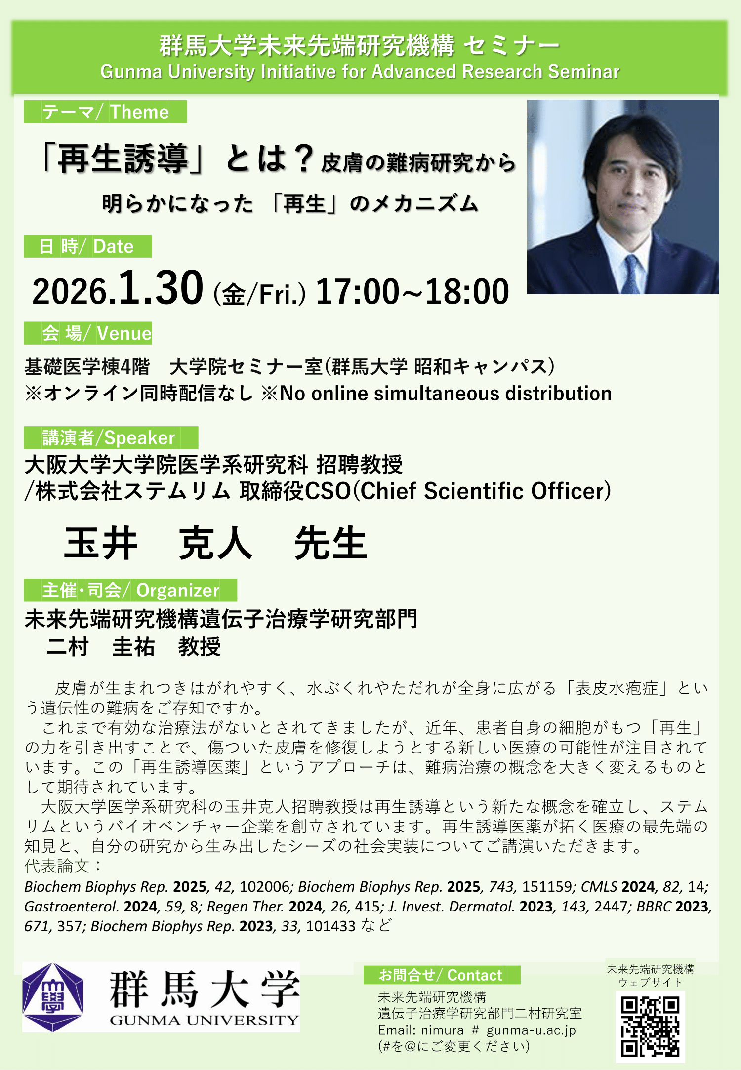 2026年1月30日(金)、群馬大学未来先端研究機構セミナーを基礎医学棟4階大学院セミナー室にて開催いたします。