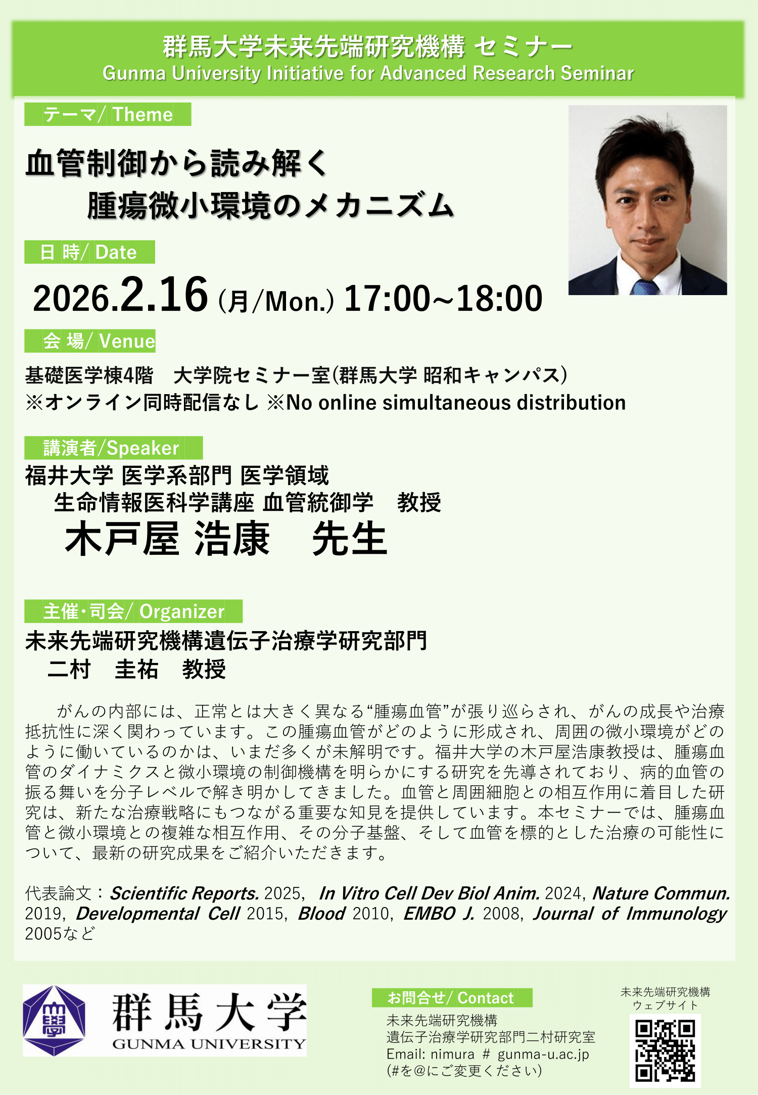 2026年2月16日(月)、群馬大学未来先端研究機構セミナーを基礎医学棟4階大学院セミナー室にて開催いたします。